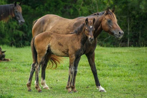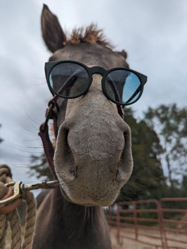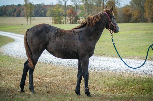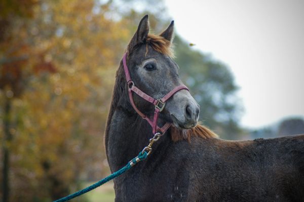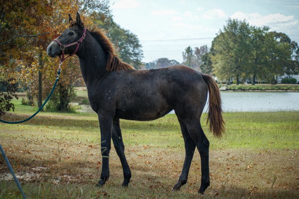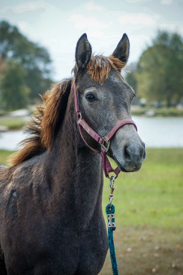 We tend to think Treasure is a pretty cool kid (see sunglasses photo). Treasure is very cuddly, leads well, loads well, has made several trailer rides up and down the eastern seaboard by herself and with other horses, and is learning to pick up her feet. She can be hard to catch, as many babies are. She's so sweet, we have complete faith she will outgrow this as she learns that humans are full of cuddles and treats. Treasure is sired by the very popular TBS Declan Pondi and out of a polo bred TB mare, so she should have all the athletic potential in the world to take in whatever direction you want to go! We have had many Declan babies and they are all very friendly, highly trainable , and super athletic! She should mature to small horse size, so she will be a great size for a small adult or a teen!
